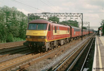 This website is dedicated to the BR built class 90s, which were manufactured and assembled in Crewe Works by BREL from 1985 until completion in 1990 under contract to GEC. The original fleet size consisted of 50 locos as new and these were numbered 90001-90050. However, In the early 1990s, those locomotives numbered higher than 90025 were renumbered to 90/1 and 90/2 for a number of years, but they all reverted back to 90/0 in the early 2000s. At the time of updating this webpage (20/7/25), there were 30 class 90s out of a possible 50 available for traffic including any engines stopped for routine maintenance, which are split between Locomotive Services and Freightliner. This leaves 20 locomotives unaccounted for: ten engines have been disposed off, nine are in store at Crewe IEMD and 90050 is at the Crewe Heritage Centre. The class 90 locomotive celebrated their 37th year of operations on the July 12th 2025. The first Class 90 to work a passenger train was 90003, having been attached to the 13:46 Blackpool North to London Euston service at Preston on July 12th 1988 owing to a failed class 86 the previous day (90003 was used as a driver training loco in the Preston area at the time). It could however be argued that 90005 was in fact the first Class 90 to work a service train after it performed a VIP service to Northampton in March 1988 in readiness for naming - she was subsequently called 'Financial Times'. It is interesting to note that the first loco to be out-shopped from Crewe was 90001 in October 1987 which went to Derby to be a test engine for several months and saw action on the WCML as well as on the Old Dalby Test Track until accepted into traffic during 1988. One of the most bizarre situations to arise with the class 90 fleet in the beginning was the deployment of 90008 to Hamburg fresh out of Crewe Works as part of the 'Hamburg International Transport Traffic Exhibition' in May 1988. The 90 went in a convoy of other locomotives and wagons including 91003 and 89001. It is unknown if the class 90 (90008) worked under its own power for any part of the trip to/from Hamburg (pictures show a raised pantograph at the Hamburg depot). If you like more information on this event, then go to http://www.traintesting.com/IVA_88.htmThe class 90 locomotives were built as a direct replacement for the then aging class 85s as well as being an opportunity to cascade a number of passenger class 86s to East Anglia. The design specification was based on a tried and tested system which BR had developed over the years. Furthermore, one must not forget that the class 90s were a later version of the class 87. Incidentally back in 1987 the original number sequence for the Class 90s took the form of 87/2s - I recall seeing what is now 90001 at a Crewe Open Day in 1987 as a young lad with 87201 written on the bodywork, but this numbering system was short lived and the rest as they say is “history”.The maximum speed of a class 90 is 110mph, although they have been known to go faster in days gone bye under test conditions. These engines are NOT permitted to operate at 125mph unless they are regeared and adapted to operating with disc brakes. The 90s entered service as a mixed traffic locomotive and have featured on both freight and passenger trains - this trend continues to this day (2/2/24), albeit most of the active fleet are dedicated to freight now , whilst those preserved by LSL generally work charter trains and the occasional passenger train. This situation may change if and when the DB Cargo 90s find a new home.A more detailed introduction and analysis of the class 90 fleet can be found in the 100th issue of “Today’s Railways (UK)” which was published on the 8th March 2010. Also further sub-pages of the website cover other areas of the class 90s history which includes operational routes, livery combinations, operating characteristics, technical capabilities and naming facts /nameplates. It is also worth reviewing the “train testing” website which has a wealth of information on the class 90s.Moving on to the present day (July 2025), the class 90s continue to operate freight trains under the stewardship of Freightliner only with approximately 50% of the fleet still in active use. At the time of writing though, class 90s no longer work daily passenger trains, having finished in East Anglia in late March 2020 due to the introduction of Flirt units. Furthermore, It was hoped that DB Cargo 90s would work with MK4s on passenger duties between Euston and Blackpool from the Summer of 2020. However, due to the Covid-19 pandemic, this plan was scrapped. Further updates will be added to this page as they become known, so in the meantime enjoy the BR Class 90s and if you have any questions or comments, please drop us an email.Present & FutureAs noted above, the Class 90s entered their 37th year of passenger operations on the 12/7/25. It is unclear what will happen to these locomotives in years to come, but at the time of writing in July 2025 the current fleet size has stabilised with enough work to go around for the foreseeable future for Freightliner and Locomotive Services. However, there is a lot of uncertainty with the DB Cargo Class 90s following the sale and disposal of 90017, 90022, 90023, 90025, 90027, 90030, 90031, 90032, 90033 and 90038, leaving just 9 locomotives left in the DB fleet which have not worked since the middle part of 2023 (the engines concerned are 90019, 90020, 90024, 90028, 90029, 90034, 90035, 90036, and 90037, which are all stored at Crewe IEMD).